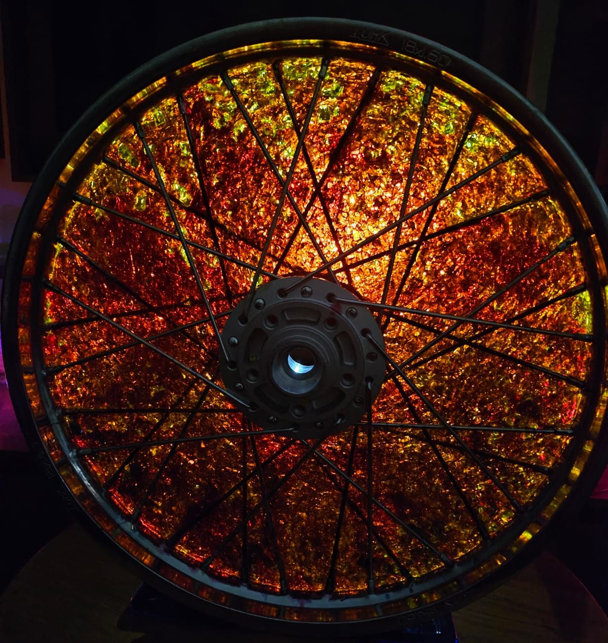 O amortecedor Generativo, tem uma roda moderna bonita e tecnológica, tem na composição até chips e semicondutores reciclados de computador, iPhone ricos em metais nobre, ouro prata e cobre.